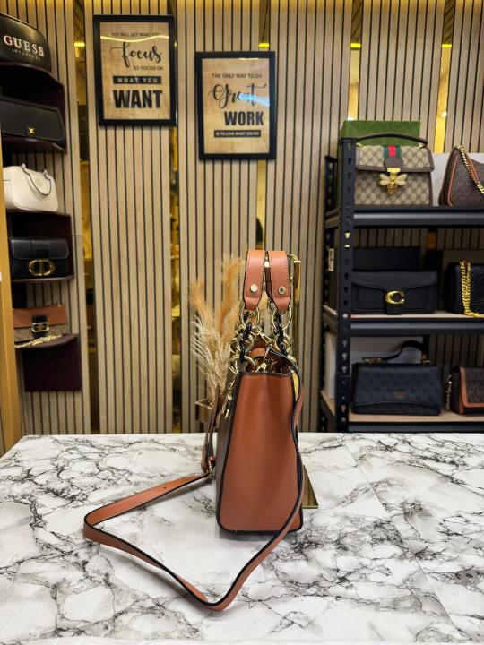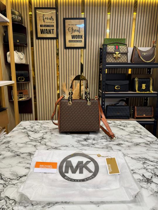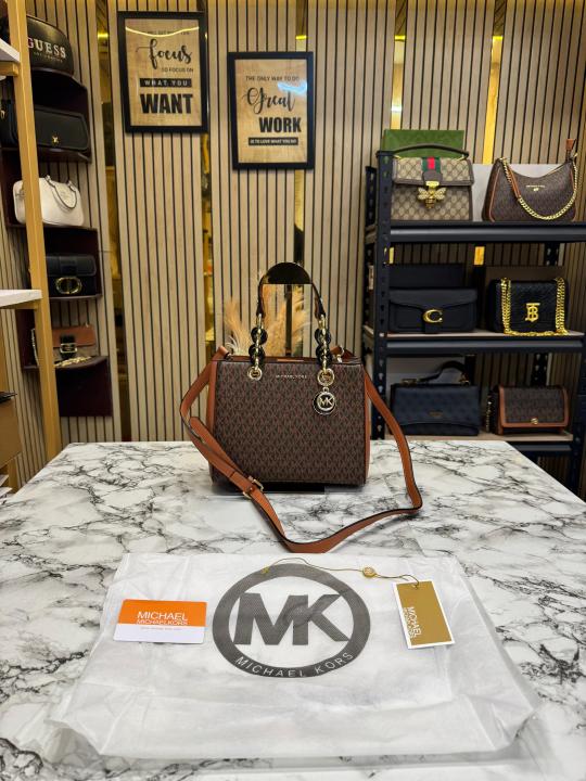 Michael_Kors Cynthia Signature Logo Satchel Bag With Dust Bag (Brown)